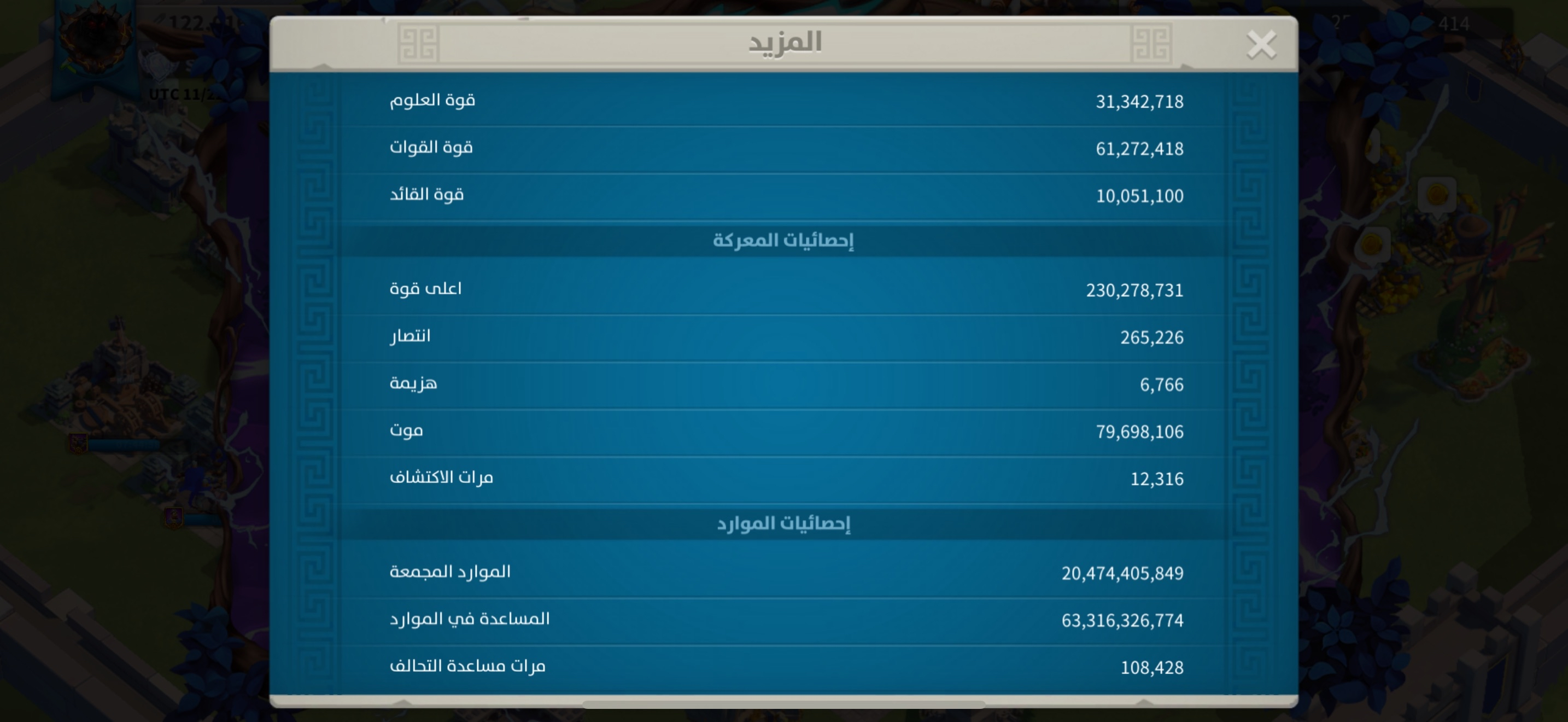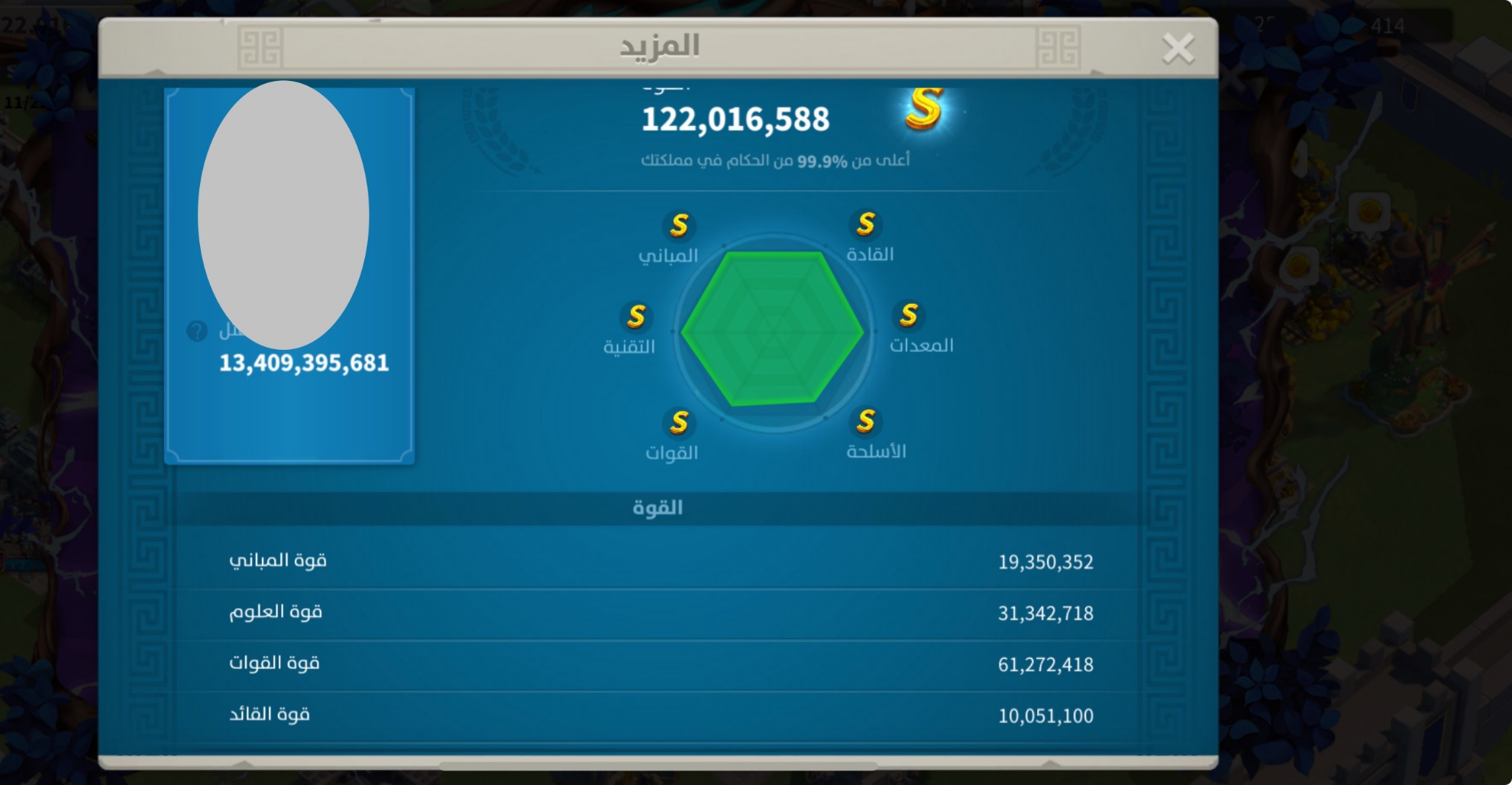 • kill: 13.4B نقاط القتل: 13.4 مليار , • power: 122M القوه: 122 مليون , • vip: SVIP ——————————- • Golden head: 940 ——————————- • passports: 158 جوازات السفر: 158 فضة : 20 م (جاهز للهجرة) ——————————- • maxed commanders: 54 القاده الماكس: 54 + كثير قادة قريب ماكس ——————————- • Legendary skins: 7 سكن مدينه: 7 ——————————- • legendary Equipments (special): 57 (34) معدات اسطوريه (مخصص): 57 مخصص : 34 ——————————- نقوش اسطورية : 5 مزارع : 2
